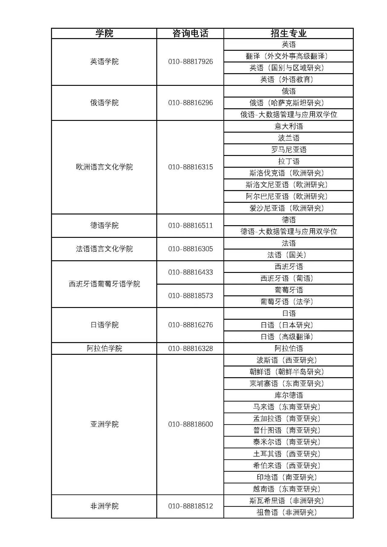 (一)外语类:英语、英语(国别与区域研究)、英语(外语教育)、翻译(外交外事高级翻译)、日语、日语(日本研究)、日语(高级翻译)、俄语、俄语(哈萨克斯坦研究)、俄语-大数据管理与应用双学位、德语、德语-大数据管理与应用双学位、法语、法语(国际关系)、西班牙语、西班牙语(葡语)、葡萄牙语、葡萄牙语(法学)、阿拉伯语、阿尔巴尼亚语(欧洲研究)、波兰语、斯洛伐克语(欧洲研究)、罗马尼亚语、意大利语、斯洛文尼亚语(欧洲研究)、爱沙尼亚语(欧洲研究)、拉丁语、波斯语(西亚研究)、朝鲜语(朝鲜半岛研究)、印地语(南亚研究)、柬埔寨语(东南亚研究)、马来语(东南亚研究)、希伯来语(西亚研究)、越南语(东南亚研究)、土耳其语(西亚研究)、泰米尔语(南亚研究)、普什图语(南亚研究)、孟加拉语(南亚研究)、库尔德语、斯瓦希里语(非洲研究)、祖鲁语(非洲研究)等,共41个专业及方向。