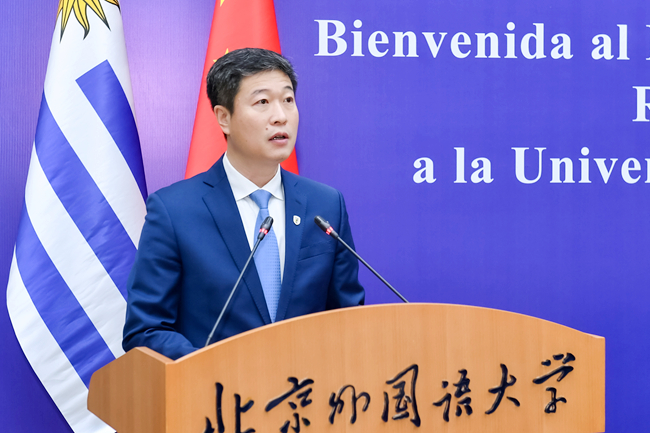 李海代表北外致辞,欢迎奥尔西总统到访北外。李海简要介绍了北外的办学历史和发展情况,回顾了北外西班牙语专业的悠久历史和丰硕成果,他表示,北外一直与乌拉圭保持着紧密的合作往来,期待进一步深化与乌拉圭高校和学术机构的交流合作,培养更多通晓彼此语言文化、推动中乌友好的青年使者。