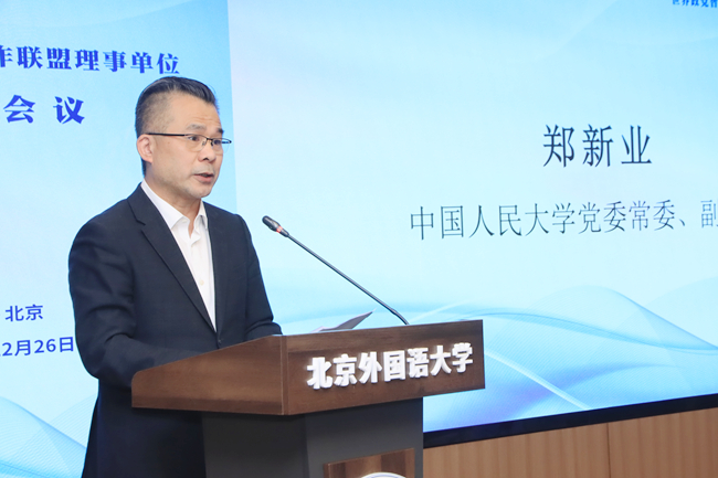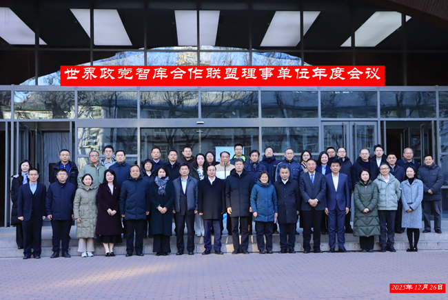 12月26日,世界政党智库合作联盟理事单位年度会议在北京外国语大学举行。中共中央对外联络部部长助理金鑫,北外党委书记李海,党委副书记贾德忠,党委常委、副校长赵刚,嘉兴大学党委书记沈希、党委副书记陈立力,中国人民大学党委常委、副校长郑新业出席会议。
