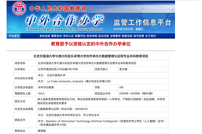 近日,教育部中外合作办学监管工作信息平台公布经批准设立和举办的最新中外合作办学项目名单,北京外国语大学与澳大利亚乐卓博大学合作举办的大数据管理与应用专业本科教育项目通过资格认定,将于2026年秋季启动首批招生。这是北外获批设立的又一重要中外合作办学项目,标志着北外在“人工智能+大数据+管理”交叉学科领域的国际化办学布局取得新进展。