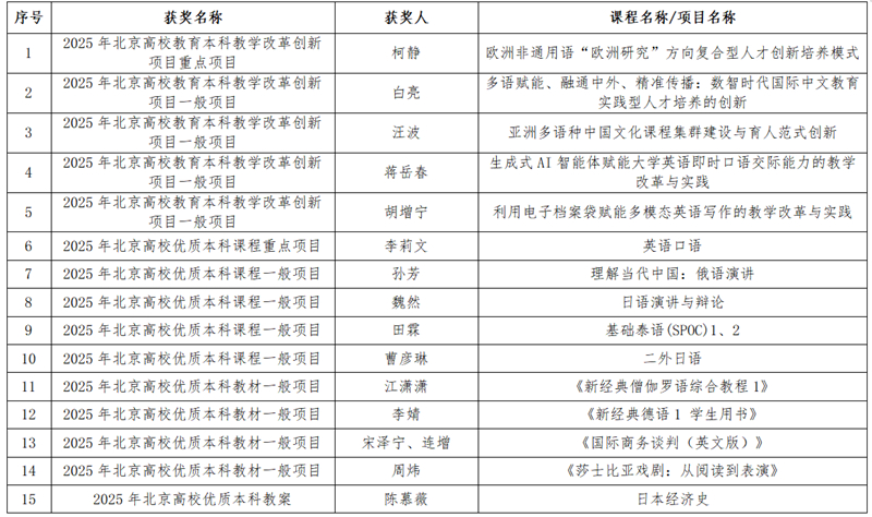 近日,北京市教育委员会发布《关于公布2025年北京高等教育本科教学改革创新项目的通知》等多项教学教材奖获奖名单,北外共有7个奖项,24个团队/个人获奖。