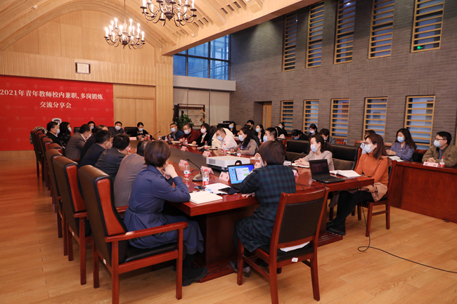 首批校内兼职、多岗锻炼的青年教师依次分享发言。16位兼职青年教师生动分享了自己在实际工作中的收获和感受,表示经过九个月的锻炼,自身在换位思考、锤炼性情、拓宽视野、统筹协调等方面的能力得到了充实和提高。兼职教师所在二级学院和职能部门负责人代表也从学院和职能部门的角度肯定了青年教师校内兼职、多岗锻炼的工作成效,这一举措充分体现了学校党委关心人才、爱惜人才、培养人才,使得青年教师更加了解学校事业发展大局,政治站位更高、视野更加开阔,同时青年教师的加入也开创了管理工作新局面,让北外更加和而不同,各美其美,美美与共。