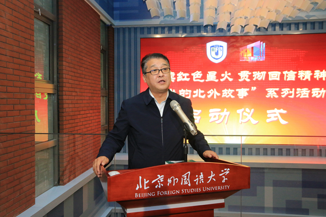 在全校掀起学习贯彻习近平总书记重要回信精神的热潮之际,为充分发挥离退休老教授、老同志教书育人的传帮带作用,传承北外红色基因,培育“三有人才”,深入推动学习宣传总书记重要回信精神走深走实,10月14日,重阳节当日,北京外国语大学在新校史馆报告厅举办“赓续红色星火,贯彻回信精神”——“我的北外故事”系列活动启动仪式。北外党委副书记、纪委书记胡志钢,党委常委、副校长丁浩出席活动,活动由丁浩主持。