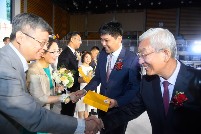 现场播放了纪念婚礼特制短片,在座的校友、师生感动不已。随后,26对校友伉俪在花童的引领下和大家的祝福声中缓缓步入会场。新郎们一身西装稳重挺拔,新娘们一席洁白婚纱优雅端庄。他们相对而立,深情拥抱,交换婚戒,郑重许下一生一世的诺言,将美好爱情永恒定格。张幼云校友现场有感而发,数次哽咽,向母校深情表达了感激之情。