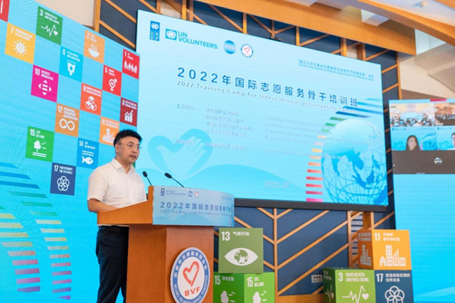 联合国开发计划署助理驻华代表张卫东,联合国志愿人员组织中国国别主任张楠,中国国际经济技术交流中心联合国业务一处处长刘军,外研集团(外研社)党委书记、董事长,外研社社长王芳,北外团委书记黄伦伦,北外学院、国际组织学院党总支副书记李爱国以及清华大学、北京大学、北外项目负责人等通过线上线下方式参加开班仪式。来自首都高校、北京外语志愿者总队的有关负责人和骨干,以及北京选派联合国青年志愿者约50余名学员参训。