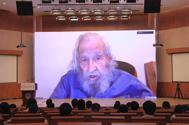 乔姆斯基从新世纪生物神经科学、脑科学的迅猛发展给生物语言学研究带来的机遇与挑战出发,重点阐释了在新的科技发展形势下生物语言学的核心问题与前景。北京外国语大学本硕博学生以及部分教师现场聆听乔姆斯基教授的讲座,近四万人在线上观看讲座。互动环节,乔姆斯基回答了现场听众的提问。
