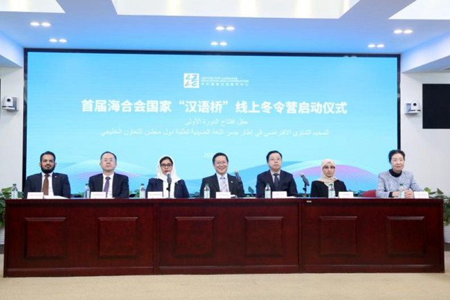 2月15日,首届海合会国家“汉语桥”线上冬令营启动仪式在中外语言交流合作中心举办。中外语言交流合作中心副主任胡志平、阿联酋驻华使馆临时代办阿米娜·哈马迪(Amna Alhammadi)等出席启动仪式并致辞,承办此次冬令营的中国高校代表及海合会国家学生代表共200余人通过线上、线下方式参加。北京外国语大学党委副书记、副校长贾文键作为承办高校代表应邀出席活动。