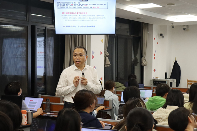 10月30日,北京外国语大学校长、党委副书记杨丹以《中国特色大国外交理论解读》为题,分别为2022级西班牙语葡萄牙语学院、英语学院本科生讲授“形势与政策”课程。