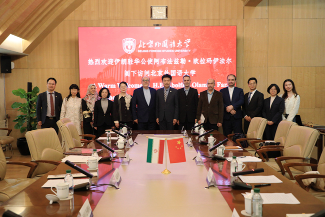 4月16日,伊朗驻华公使阿布法勒兹·欧拉玛伊法尔访问北京外国语大学,北外党委常委、副校长赵刚会见欧拉玛伊法尔一行。
